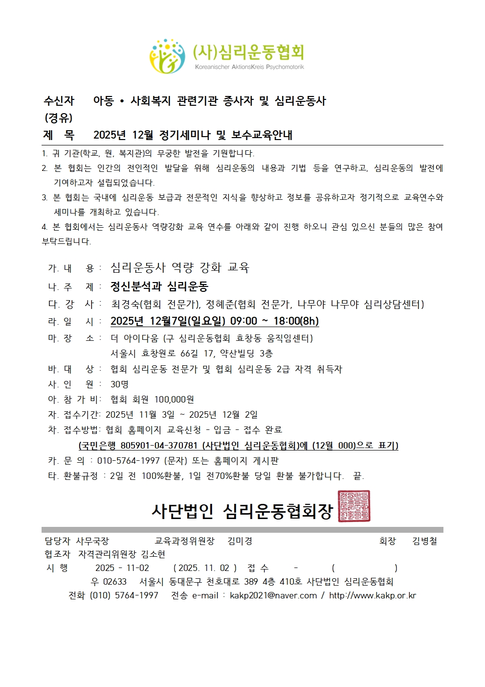 2025년 11월 심리운동사 2급 자격과정(현장경험) 연수 안내