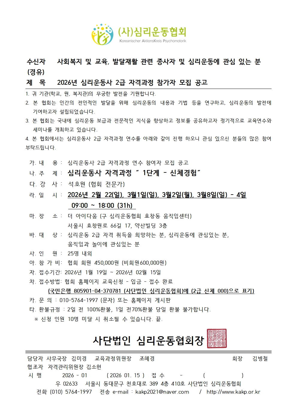 2026년 심리운동사 2급 신체경험 참가자 모집 공고