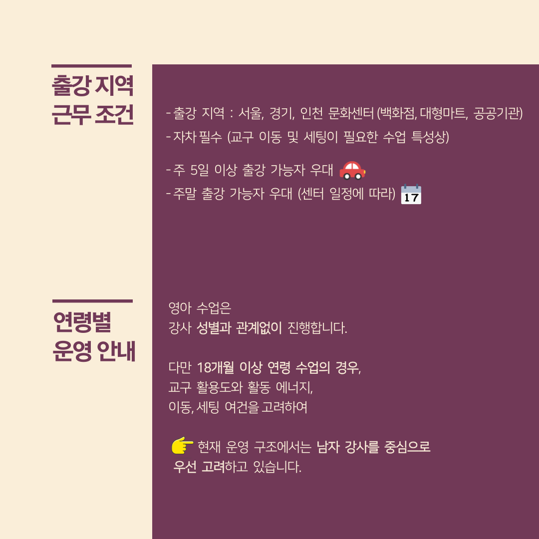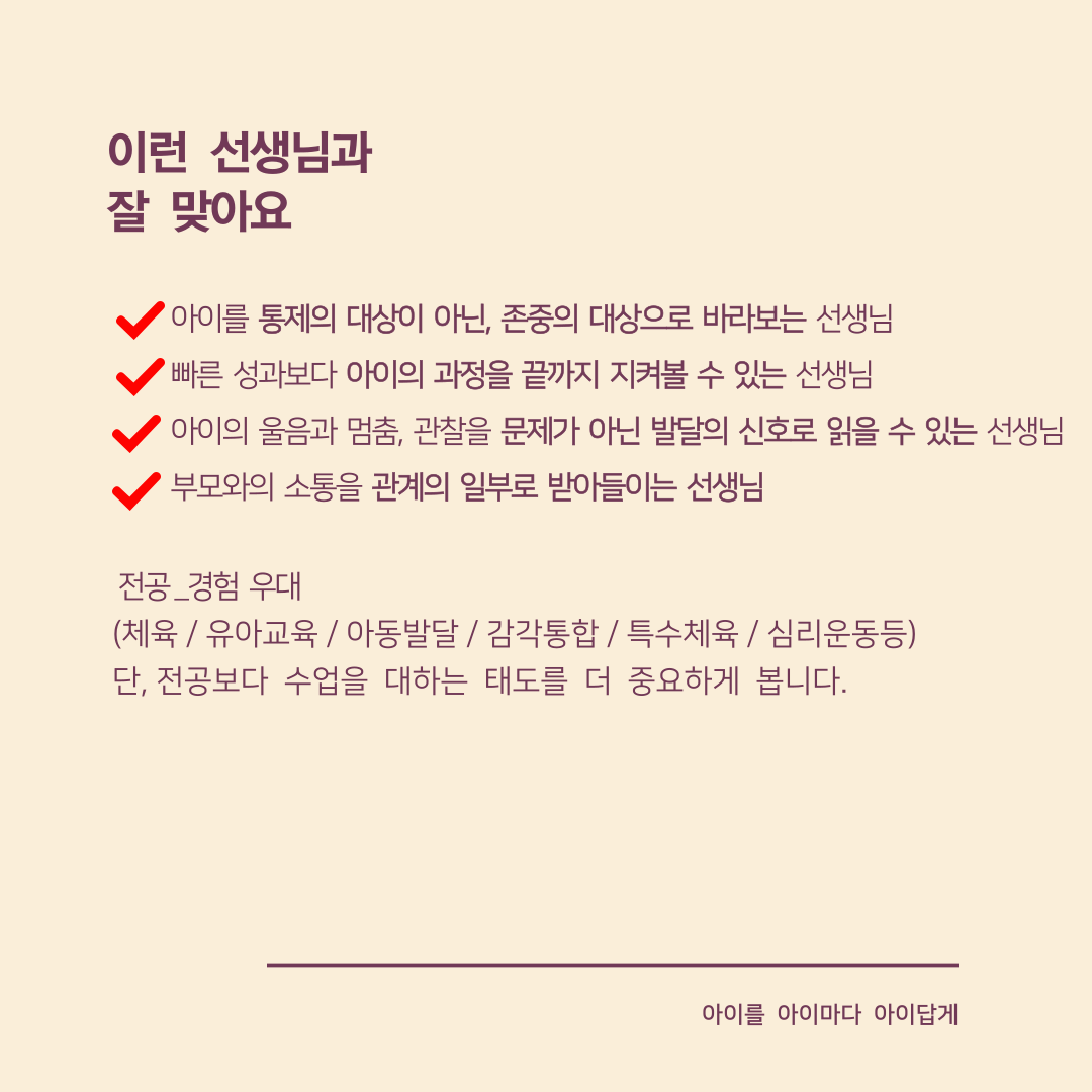 - 발달센터 중심의 제한된 대상에서 벗어나 다양한 아이들을 직접 관찰하며 수업하고 싶은 분