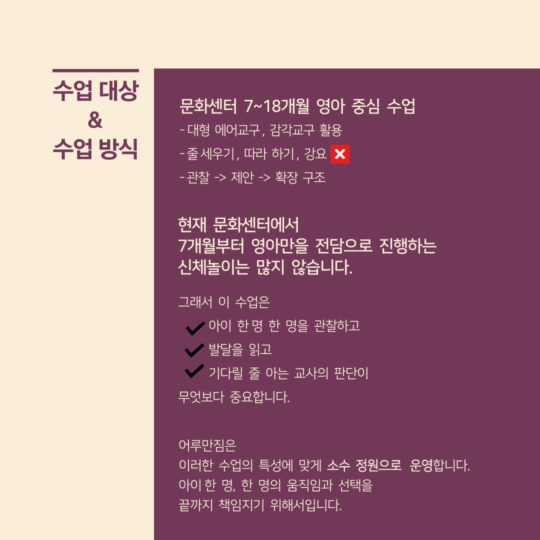 본 수업은 치료적 개입이나 교정 중심의 접근이 아닌, 관찰 → 제안 → 확장의 구조로 아이의 발달 신호와 선택을 존중하며 진행됩니다.