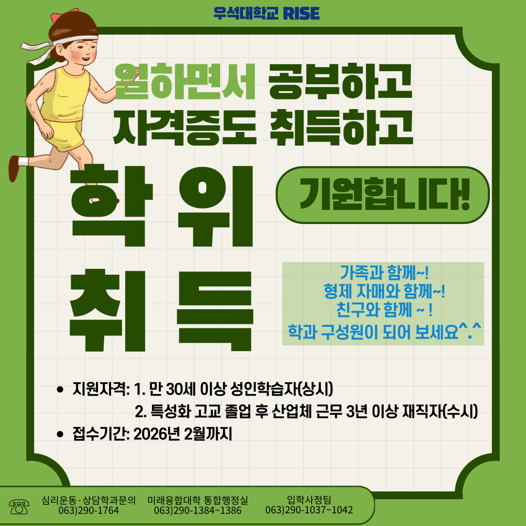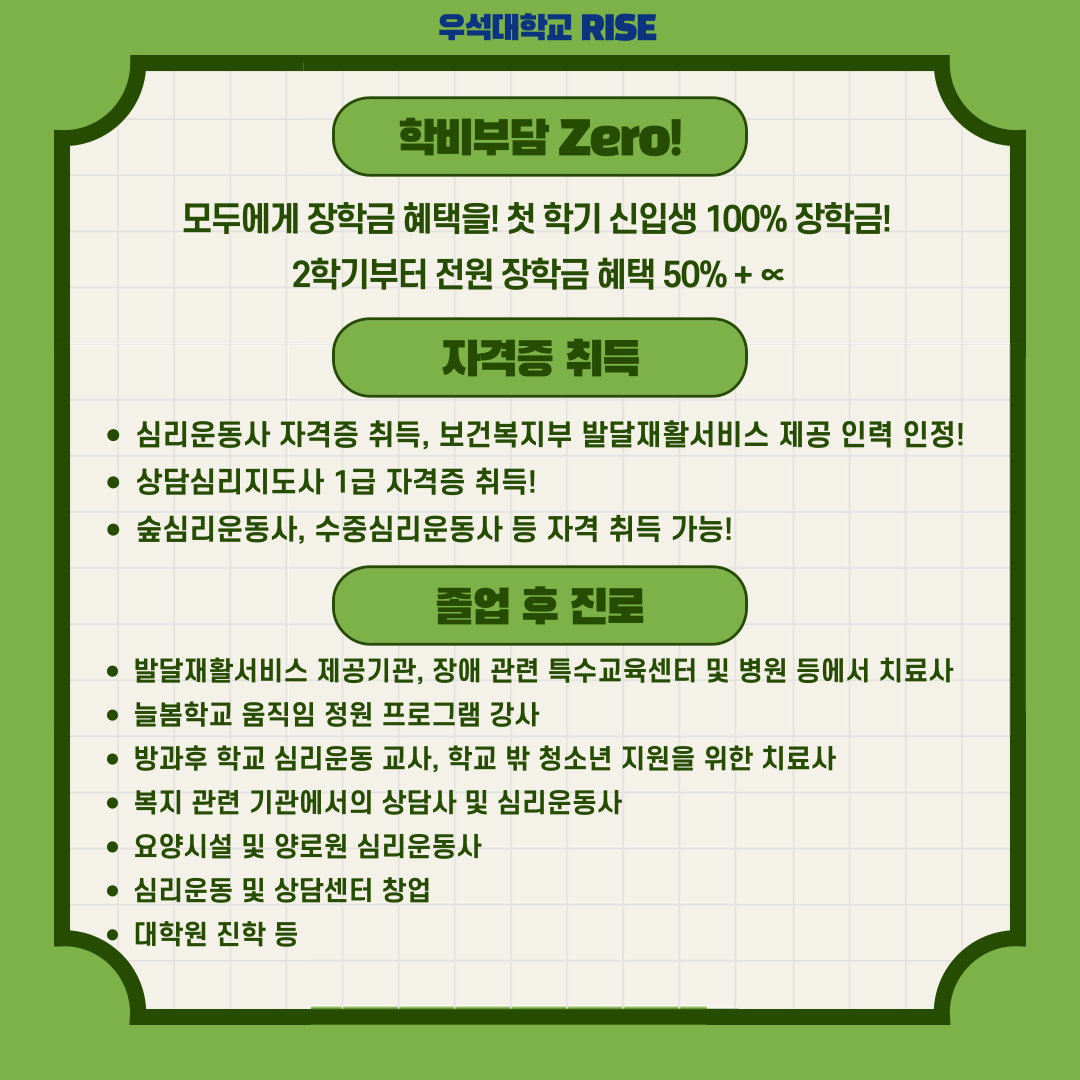 우석대학교 심리운동상담학과 신입생 모집합니다.